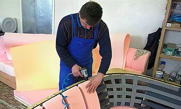 Предметы мебели собираются в обратном порядке. Отверстия под крепеж пробиваются заранее. Такой порядок позволяет избежать повреждений новой обивки. Сложность работ, длительность операций зависит от состава мебели.